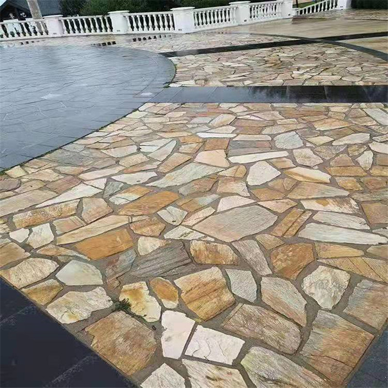 (2)黄色砂岩碎拼石,砂岩碎拼石,其外表色泽较为一致 ,平整度好,石材密度高于板岩,按颜色为粉砂岩碎拼石,黄色碎拼石 锈色碎拼石 黄锈石碎拼石 黄色汀步石 黄木纹碎拼石 天然乱石片 虎皮石碎拼石,高粱红碎拼石,石材坚硬度高,层理分辨程度不及板岩,但砂岩碎拼石其色泽由内而外,表里如一,是很好的片状园林板材,砂岩碎拼石板面直径大约在25-40公分之间,因石材厚度不同,板块大小也不同,厚度越小,加工难度越大,其断裂机率越高,所以厚度越高的砂岩碎拼石它的板面直径就会越大