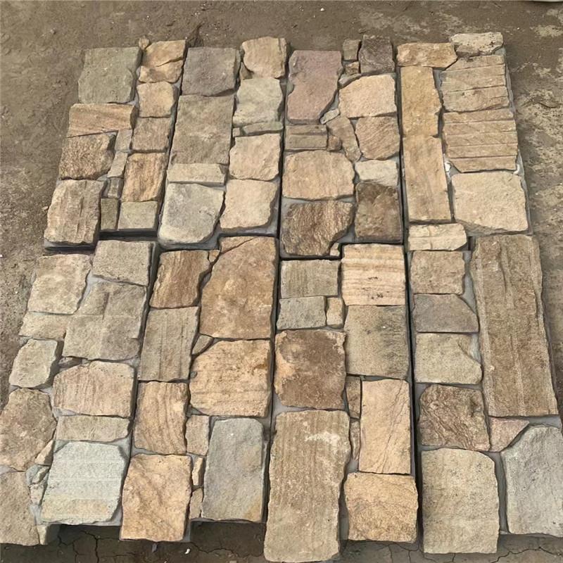 (1)黄色板岩碎拼石,板岩碎拼石,其层理分明,层理类似于页岩,层与层之间分隔薄如纸片,乱型文化石 黄色板岩片石 虎皮黄文化石 不规则文化石因其容易分层,所以加工片石难度较小,板块规格较大,常规板面直径在30-50公分之间,板岩碎拼石外表平整度较好,因其得自然层理特征,众多施工商将板岩碎拼石运用于不同的环境装饰工程之中,因其坚硬度一般,较薄的板岩碎拼石主要用于公园园林,古城,别墅,豪华营业场等各种场景的墙体建设,外表色泽自然多变,按颜色主要分类为黄木纹碎拼石,杂红色板岩碎拼,青石板板岩碎拼石,因产地不同,坚硬度和色泽都有不同的区别