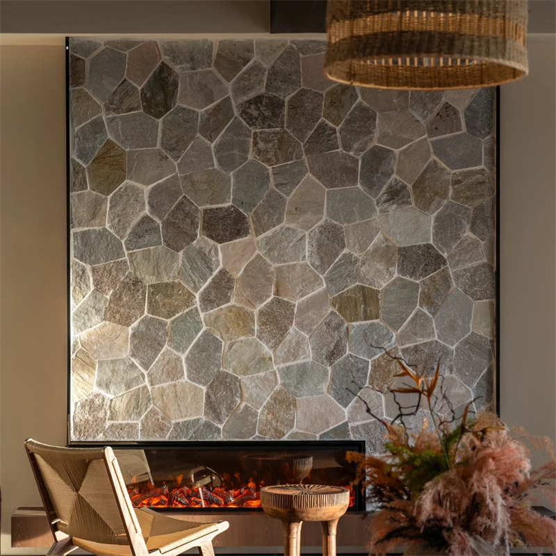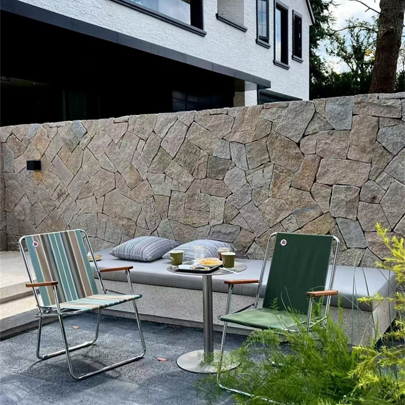搭配与养护方面,需注重 “风格协调” 与 “便捷维护”:搭配上,黄木纹碎拼石的暖调肌理需避免与高饱和冷色(如亮蓝、深紫)大量搭配,以防视觉冲突,建议以中性色(白、灰、原木色)为空间基底,搭配原木、藤编、粗陶、棉麻等材质 —— 原木强化自然感,形成材质呼应;藤编增添休闲气息;粗陶凸显质朴韵味;棉麻软化空间质感,与木纹肌���适配。养护上,天然款铺贴前涂刷石材密封剂,防止污渍渗透;日常用湿布蘸中性清洁剂(如洗洁精兑水)擦拭,顽固污渍可轻轻刷洗缝隙边缘;仿石款养护更便捷,定期清水清洁即可,禁止用酸性清洁剂(如白醋、洁厕灵),防止破坏表面木纹与色调。室外使用时,每 2-3 年检查缝隙,及时补填勾缝剂;室内潮湿区域(如卫生间)需定期检查防水性能,局部破损可更换同色系碎块,修补后不影响整体美观,长期使用仍能保持暖调木纹的自然质感。