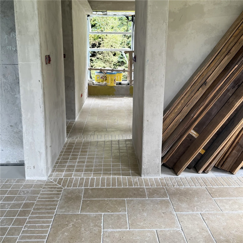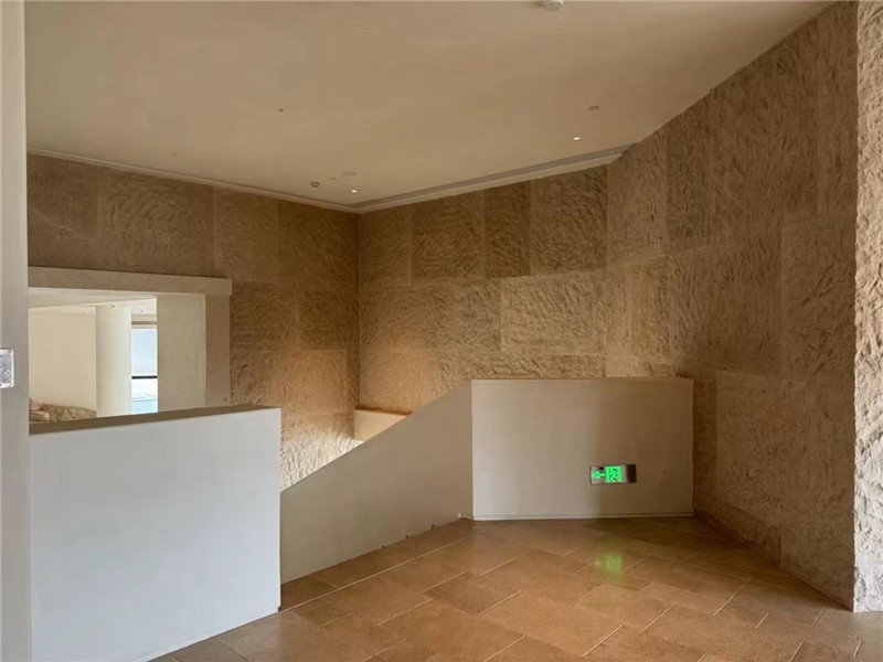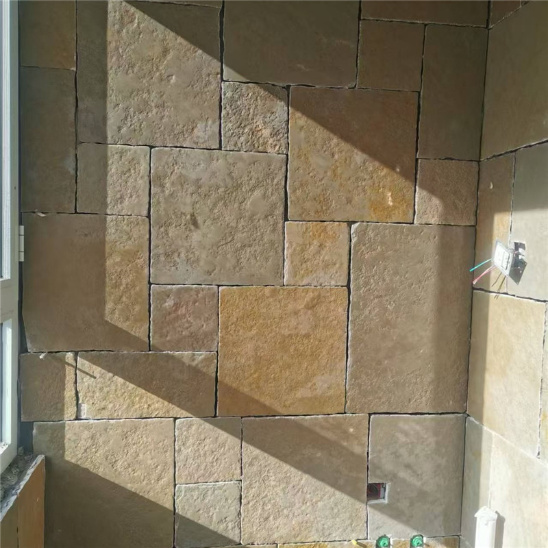 室内场景中,适配多元功能区域需求:法式复古客厅电视背景墙满贴时,选用深秋黄莱姆石(孔洞填充树脂),搭配浅灰色乳胶漆墙面、黄铜电视柜与水晶吊灯,复古肌理与轻奢元素融合,营造 “精致温馨” 的观影氛围;新中式茶室地面铺装时,采用中秋黄莱姆石(哑光面),搭配矮脚木茶桌、草编坐垫与暖光壁灯,秋黄石材的沉静与茶香交融,凸显 “禅意复古” 的品茶格调,温润触感提升赤脚踩踏舒适度;主卧背景墙装饰时,选用浅秋黄莱姆石局部铺贴,搭配浅棕色软包床头、原木床头柜与羽毛吊灯,暖调白墙营造 “秋日卧室” 的温馨睡眠环境;此外,玄关地面拼花时,用中秋黄莱姆石与浅灰色地砖拼接几何图案,划分功能区域,搭配原木换鞋凳与黄铜挂钩,进门即可传递 “复古温暖” 的归家仪式感。