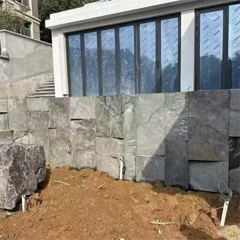 中国黑石皮墙文化石 天然自然面铺地石 虚实相生 灰色石皮板材是选取天然灰色系岩石的表层部分,经劈裂、裁切而成的薄型装饰板材,以其原生的岩石肌理、沉稳的灰色调与轻盈的形态,成为建筑装饰中传递自然质感的核心材料。这类板材厚度多控制在1-3厘米,既保留了岩石表层的天然纹路与风化痕迹,又因薄型设计大幅降低了安装负荷,适配从外墙干挂到室内背景墙的多元场景,让空间与自然达成深度共鸣。