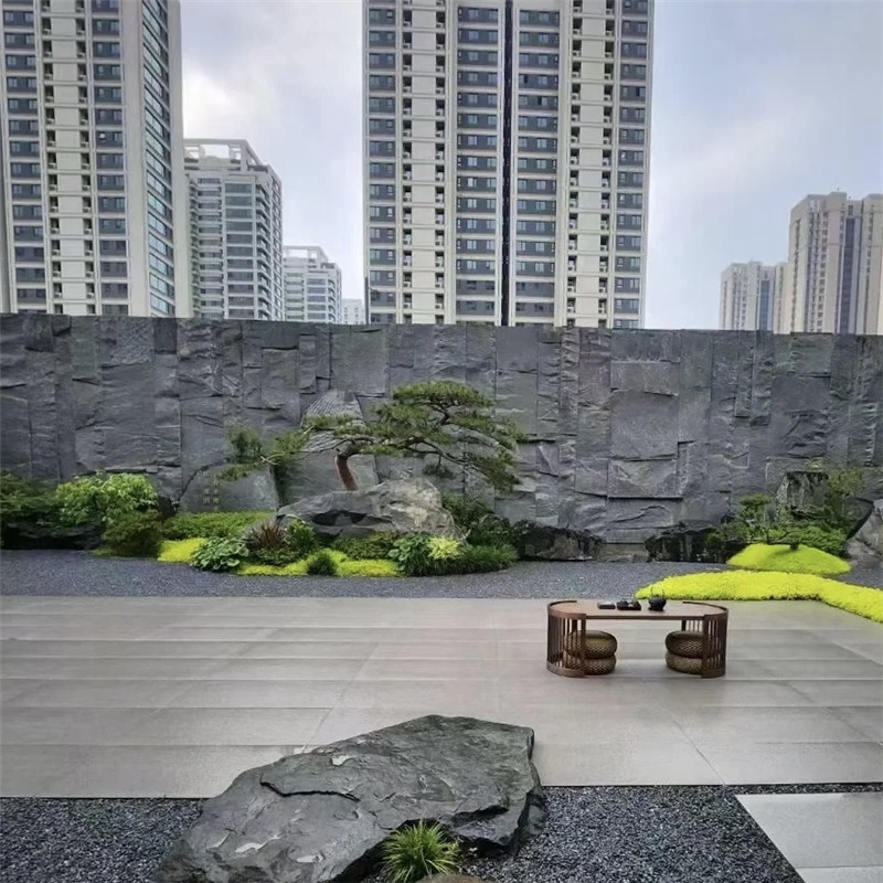 场景应用中,中国黑石皮墙文化石的 “实用性” 与 “美学性” 可充分发挥。室内场景里,客厅电视背景墙用黑石皮墙文化石局部铺贴,中间预留白色乳胶漆区域挂中式装饰画,两侧搭配木质格栅,黑石皮的深邃与原木、白色形成对比,让背景墙既不张扬又显格调;卧室床头背景墙选择小块黑石皮文化石拼接,搭配暖光壁灯,柔和光线沿石皮肌理漫射,弱化黑色的冷硬,营造出静谧舒适的睡眠氛围;书房墙面用黑石皮文化石铺贴,搭配实木书桌、古籍摆件,传递出 “书香与石韵” 的雅致意境。户外场景中,庭院围墙用黑石皮墙文化石砌筑,搭配白墙、黛瓦与爬藤植物,黑石皮的坚固与自然元素融合,既还原传统中式庭院的 “围合感”,又能抵御户外风雨;露台地面局部铺设黑石皮文化石,搭配户外实木座椅与绿植,打造出 “自然休闲” 的角落,夜晚灯光照射下,石皮肌理呈现出独特光影,增添氛围。