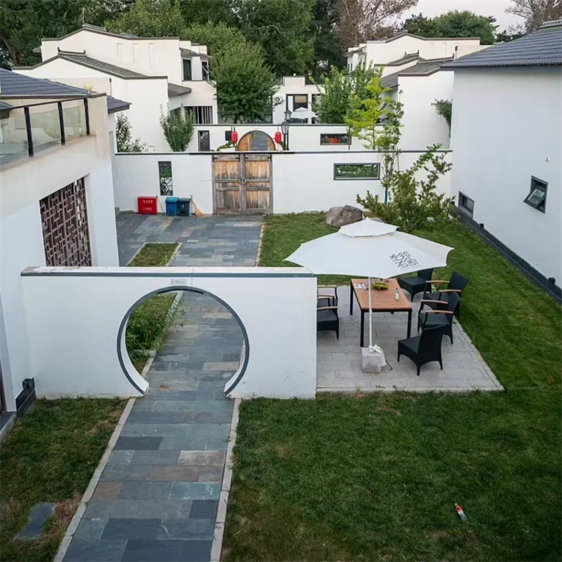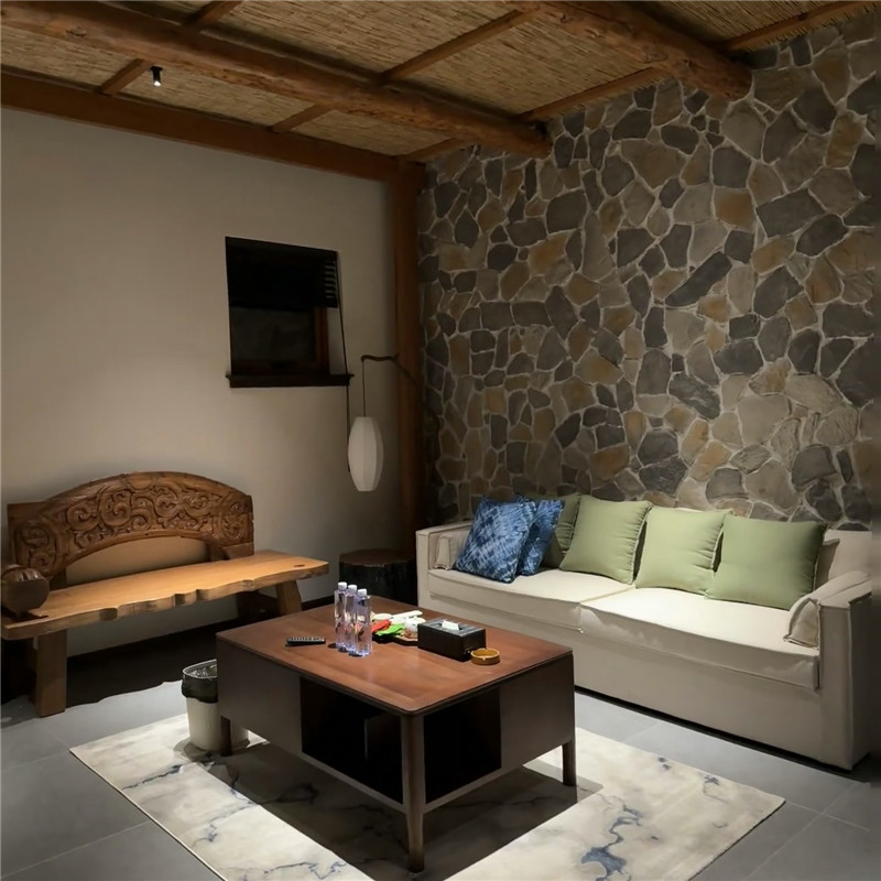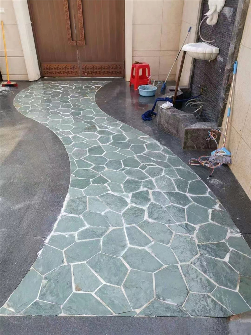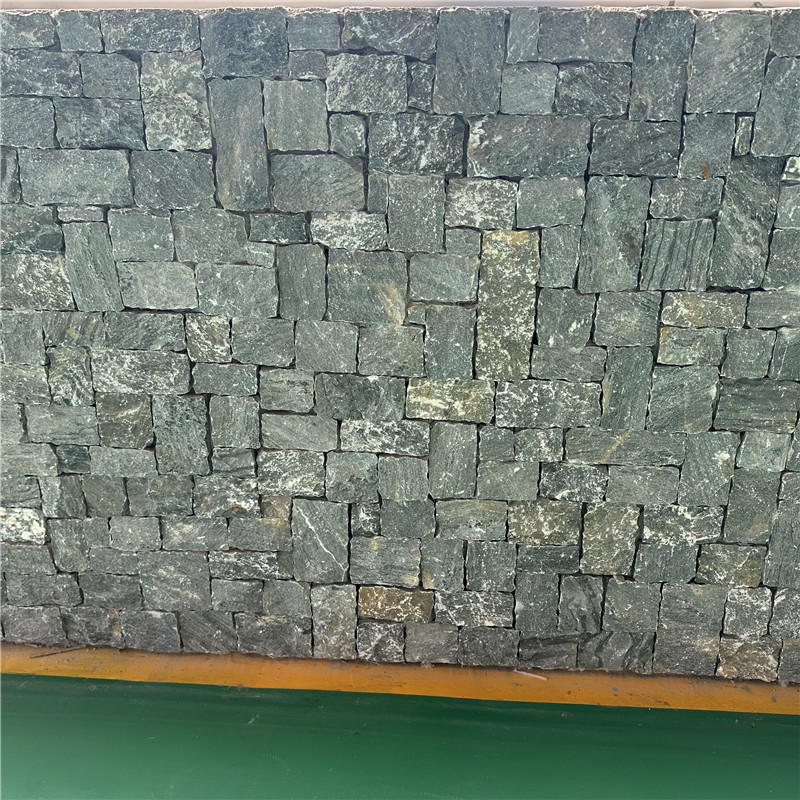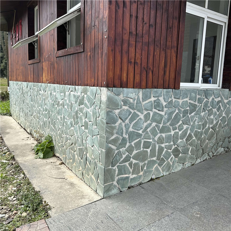 庭院饰面 园林绿化石材 青锈色板岩碎拼石 绿色冰裂纹文化石是一款自带清新野趣与自然气息的天然装饰石材,以天然绿板岩、蛇纹岩、含铁镁矿物的砂岩为原料,经劈凿、修边等工艺加工而成,保留大小错落、形态各异的原生轮廓,核心特质是石体以多元绿色为基底,涵盖墨绿、浅绿、青绿、橄榄绿等色调,部分交织着灰白、浅棕的渐变纹路与矿物斑点,表面布满自然劈裂肌理、层理痕迹,部分带有细微孔隙与风化质感,既凭借清新绿韵传递贴近自然的静谧感,又以古朴肌理彰显岁月沉淀的厚重,兼具原生粗犷与雅致灵动的双重气质。其原料多为莫氏硬度5-6级的沉积岩或变质岩,主要成分为石英、长石及铁镁矿物,密度适中、吸水率偏低,具备良好的抗压强度、抗冻融性与耐腐蚀性,能长期抵御室内外风吹日晒、雨水冲刷、土壤挤压及温度骤变,不易风化、开裂、褪色,适配北方严寒、南方潮湿等多数气候环境,广泛应用于民宿外墙、庭院景墙、复古园林饰面、文创园区景观砌筑,以及室内客厅背景墙、玄关点缀、阳台墙面装饰等场景,凭借“色调清新、质感鲜明、风格适配性强”的优势,成为新中式、自然风、乡村风、复古风空间的热门选材,既能作为主材质奠定空间清新自然的基调,也能局部点缀提升细节层次,实现美学装饰与实用性能的双重统一。绿色文化石的核心魅力在于绿韵与肌理的自然碰撞,清新绿色能与绿植、流水、木质、青砖等元素完美融合,搭配藤蔓绿植可营造郁郁葱葱的自然庭院氛围,搭配流水景观则凸显山林溪谷的灵动韵味,搭配木质构件更添乡村田园气息,相较于其他色系文化石,其绿色自带治愈感,能中和空间的冷硬感,让装饰立面更具生命力,且经长期户外风化后,绿韵会愈发温润厚重,更显与自然共生的质感。根据工艺与形态,可分为规整绿色文化石与自然形绿色文化石,规整款尺寸经初步校准,便于标准化浆砌施工,适合对平整度要求较高的外墙、围墙工程;自然形款保留完整原生轮廓,边缘粗糙自然,适配干砌工艺或景观性装饰场景,凸显原生野趣。施工环节需贴合绿色文化石的材质特性与色调特点,提前做好基层处理,砌筑承重墙体时需夯实基底土层,浇筑混凝土垫层,高大墙体增设构造柱与拉结筋,强化整体承重与抗倾覆性;干砌工艺则需铺设碎石垫层,保障透水性与基底稳固。浆砌时选用与绿色适配的浅灰色、米黄色水泥砂浆,控制饱满度不低于80%,遵循“错缝搭接、上下咬合”原则,严禁出现通缝、空缝;干砌则依托石块自身重力与咬合作用,按“上小下大、外斜内直”排布,缝隙可填充细沙、碎石或预留空隙,供苔藓、多肉等绿植生长,强化自然融合感。石缝宽度控制在2-4cm,填缝时需避免砂浆污染石材表面,若不慎沾染需及时清理,防止覆盖绿韵肌理。日常养护需兼顾质感保护与结构稳固,用软毛刷或低压水枪清理表面灰尘、杂物,避免硬刷剐蹭破坏绿色肌理与原生质感;沾染油污、霉斑时,用中性清洁剂湿敷轻擦,严禁使用强酸强碱药剂,防止腐蚀石材导致绿韵发乌、表面起砂。户外石材每2-3年涂刷一次透明渗透型防护剂,重点防护石缝与表面,既能提升抗污性与耐水性,又能锁住绿韵光泽;定期检查墙体状况,及时修补松动石块、开裂缝隙与老化砂浆,北方冬季清除积雪积冰,避免冻融循环损伤结构,长久维持绿色文化石的清新绿韵与古朴质感。