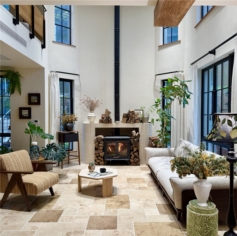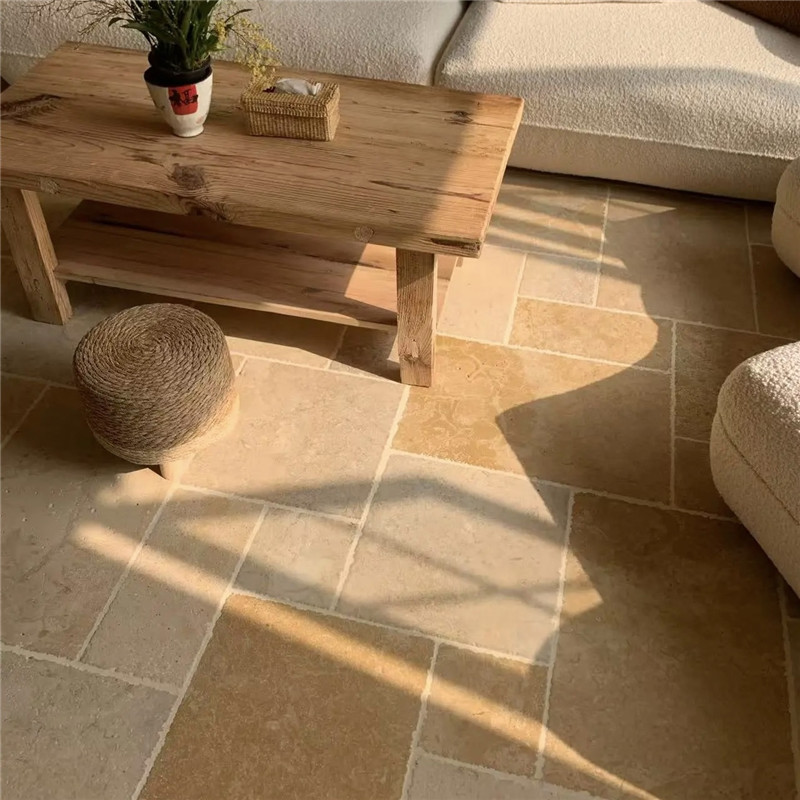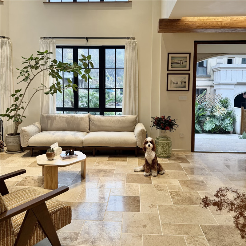 户外庭院 / 露台:乱拼或规整铺贴,搭配绿植、流水,暖金与自然相融,打造轻奢度假风。